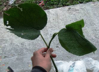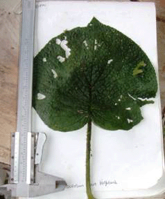 Oval shaped, heart-like leaves. Scrotum texture with deep pits. Adaxil of the leaves has a crocodile skin texture |