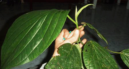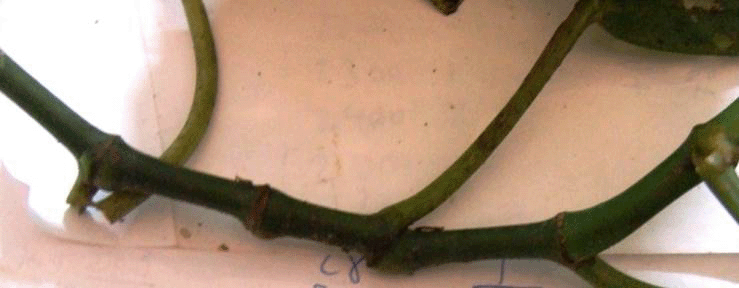 Wide lustrous leaves, parallel venation, thick stem with short internode space. Petioles are thin and with an indentation. Stem is slightly pulvinous. Found growing on a steep rocky substrate along a creek. |