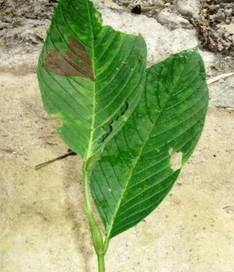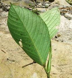 Looks like a lowland Gesneraceae with those long, white setae, and with unusual bulbs where new leaves emerge (and where ants are found). Long, bright green leaves with setae on the mid vein. Ants living in enlarged petioles. |