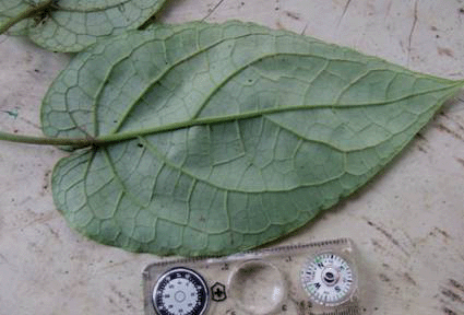 Heart shaped leaves, dull green color, semi-hispid texture, strong tertiary venation. |