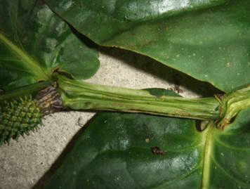 Ridges or wings in stem pronounced. Pale green stem, very short petiole, leaves wider at base. Ants living inside the hollow stem. |