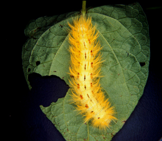 The larvae of this species are polymorphic for thier base color which can be yellow, white, black or some mixture. The prolegs of all morphs have red feet. Caterpillars have small, irritating, silicaceous spines on thier bodies under the long visible hairs. |