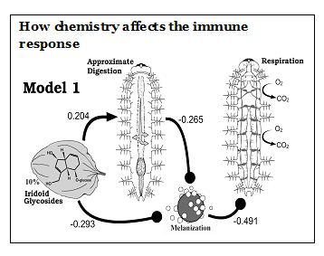 Specialist and generalist caterpillars are different in many aspects. My research highlights these differences in a tritrophic context by focusing on plant chemistry and natural enemies. For example, quite often, specialist caterpillars are physiologically constrained to feed on plants with specific leaf chemistry. In addition, they have adapted to sequester plant compounds in their tissues thereby becoming toxic to predators. In contrast, generalist caterpillars may encounter several different classes of plant chemistry over the course of a day. Given these differences in host plant chemistry, one question that I am interested in addressing is: what are the physiological differences between specialist and generalist caterpillars? To answer this question, I have focused on the insect immune response, which is one of the most important defenses caterpillars have against natural enemies. Using an immunoassay, I have shown how host plant chemistry differentially affects a specialist caterpillar (Junonia coenia, buckeye) and a generalist caterpillar (Grammia incorrupta, woolly bear). In the case of the buckeye, individuals ingesting and sequestering high concentrations of plant compounds are immunocompromised. With the woolly bear, there is evidence that plant compounds help the immune response; however, this question is still under investigation. From these data, I hypothesize on how natural enemies may be influencing the evolution of the insect immune response. |