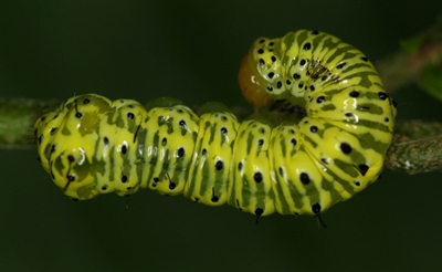 The larva of this species changes coloration and color pattern in every instar. At the change from 3rd to 4th instar it also changes from a shiny, cellophane-like skin to a more matte or velvet skin. |