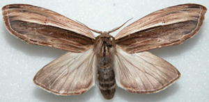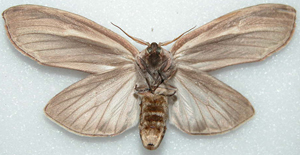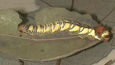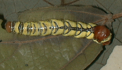 Young larvae typically had a white background color and fed at the tips of leaves, hiding on a frass chain attached to the vein. They became yellow opon reaching their third instar. Older larvae cut the major veins leading into the leaf tissue and would hide in this "tent" when not feeding. |