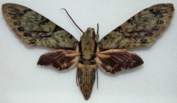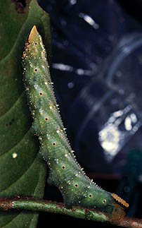 Later instars of this species hide during the day and move up into the foliage to feed at dusk and overnight. Earlier instars (1 and 2) hide on the host plant. The frass of this caterpillar crumbles as it is extruded, ending up as small pices of frass instead of large, obvious, pellets. When later instars of this caterpillar are severely harrassed they emit a strong smelling froth from their mouths. |